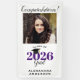 This vertical banner features a graduation design with a square photo frame for a picture of the graduate. Personalise this modern banner with the graduate's name. The text reads "Congratulations! Class of 2026 Grad" with the year appearing in purple. The design is accented with calligraphy text and a graphic of a graduation cap.