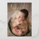 Simple newborn birth announcement card with "thank you" in a modern script along with baby's name and birth date. All text on the front is in real gold foil. The back has a photo collage with three square pictures along with your personal message. This elegant birth announcement is a great way to announce the birth of your new baby boy or baby girl.