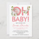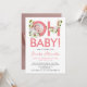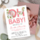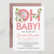 This modern new baby announcement has a large bold pastel pink script saying OH baby and some delicate white and green floral ornaments. The back is with a customisable photo and name of your baby.