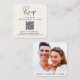 Modern light cream wedding RSVP square enclosure card with "Rsvp" in a contemporary script. Input your wedding website address to create a QR code for guests to scan to RSVP online. The back features your photo overlayed with your names and wedding date joined together by a heart.