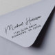 Stylish return address stamp. Your name takes centre stage in a modern stylish script and your address is displayed in a clean and legible typography, ensuring clarity and easy readability.