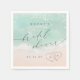 Beautiful turquoise abstract watercolor sparkling ocean wave and hearts in the sand beach background, toped with stylish script and elegant serif font, modern and simple. Great napkins for nautical beach wedding shower, tropical destination wedding, coastal ocean themed bridal shower in summer.
