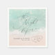 Beautiful turquoise abstract watercolor sparkling ocean wave and hearts in the sand beach background, toped with stylish script and elegant serif font, modern and simple. Great the night before napkins for romantic modern rehearsal dinner, nautical beach wedding, tropical destination wedding, coastal ocean themed wedding in summer.