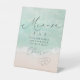 Beautiful turquoise abstract watercolor sparkling ocean wave and hearts in the sand beach background, toped with stylish script and elegant serif font, modern and simple. Great bridal shower mimosa bar sign for nautical beach bridal shower, tropical destination wedding, coastal ocean themed party.