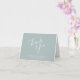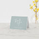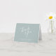 This elegant modern minimalist wedding thank you card features stylish handwriting script in white on a sea glass green background. Add the couple's names and wedding date in sans serif font.
