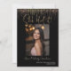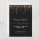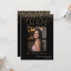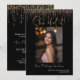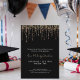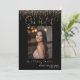 A simple, modern graduation party invitation featuring hanging strings creating a gold sparkling design accent. Elegant black and gold with the text "She did it!". Add graduate photo on front and party details on the back.