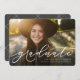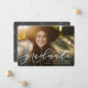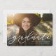 A playful but simple script graduate sits at the bottom of a horizontal photo. The custom text includes room for the graduate's name and also school and year details. The neutral grey backer has a simple grid pattern, and the colour can be changed by clicking "customise further." Announce your graduate's accomplishment to friends and family with this design!