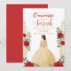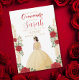 nvite friends and family to a magical celebration with this stunning Quinceañera invitation! Featuring a beautifully illustrated young woman in a golden gown surrounded by elegant red roses and intricate gold details, this design radiates sophistication and charm.