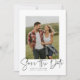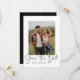 With a single vertical photo and a modern script written "save the date," this card is the perfect way to announce your engagement and upcoming wedding to friends and family. The black text is bold and modern but still sophisticated. The customisable text on the front has room for names, date, location and other information like a wedding website. The back is a black and white striped pattern. The black colour is editable by clicking "Customise."