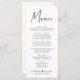 Modern wedding reception menu featuring "Menu" in a chic contemporary script, your custom menu in simple typography, your names joined by a heart and your reception date.