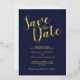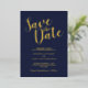 This design title "Save the Date" in real gold foil modern script font with wedding details in real gold foil modern sans serif font on navy blue background.