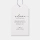 These modern script wedding welcome gift tags are perfect for a minimalist wedding. The simple black and white design features unique industrial lettering typography with modern boho style. Customisable in any colour. Keep the design minimal and elegant, as is, or personalise it by adding your own graphics and artwork. Personalise the tags with the location of your wedding, a short welcome note, your names, and wedding date. These tags are perfect for destination weddings and hotel guest welcome bags.