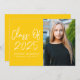Modern graduation party invites featuring "Class of 2025" in a white handwritten script on a yellow background. Personalise the front of the graduation invite by adding the graduate's name, school name, and vertical photo. The invite reverses to display your graduation party details in white lettering on a yellow background.