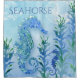 Modern silhouette style seahorse with modern geometric line pattern and a sea glass inspired colour palette over a watercolor wash that varies from warm aqua blue to a cool royal blue. Typography style text design reads, "SEAHORSE," and mixes with vintage art elements such as a nautilus shell and tropical fish. In a contemporary colour palette of blues and greens with highlights in navy blue, mint and emerald green this hand painted watercolor, painted in a loose painterly style is timeless. Copyright Audrey Jeanne Roberts, all rights reserved.