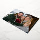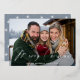 Modern holiday photo card featuring "Merry Christmas" displayed in a handwritten silver foil script overlaying your horizontal photo. Personalise the front of the foil Christmas photo card with your family name and the year. The card reverses to an icy blue and white snowflake pattern.