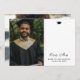 Modern graduation thank you card printed with two of your graduation photos, a smaller one on one side and a larger on the other side. Your school and class of year written in a neat font with your name in a signature script with room to write a personal note by hand beneath a small graduation cap icon.
