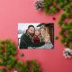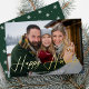 Modern holiday photo card featuring "Happy Holiday" displayed in a handwritten gold foil script overlaying your horizontal photo. Personalise the front of the foil holiday photo card with your family name and the year. The card reverses to a green and white snowflake pattern.