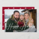 Modern holiday photo card featuring "Happy Holidays" displayed in a white handwritten script overlaying your horizontal photo. Personalise the front of the holiday photo card with your family name and the year. The card reverses to a red and white snowflake pattern.