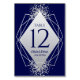 An elegant table number card featuring the number inside a silver diamond with a sprinkle of silver glitter on a deep navy blue background. You can change the font style and colour by clicking on the customise link. This is part of a wedding suite that includes a matching menu, place cards and many more items.