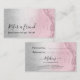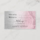 Elegant and stylish makeup artist referral card featuring faux pink rose gold glitter marble texture, silver texture and elegant calligraphy font.