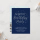 Let's celebrate your special day with this stylish surprise birthday party invitation. This design features chic silver glitter typography and sparkle element on a navy blue background. Replace or delete the sample photo on the backside. This invitation will be perfect for a modern surprise birthday party for any age.