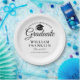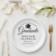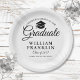 An elegant black and white graduation party paper plate featuring a black cap topper with your grads details set in modern typography. Designed by Thisisnotme©
