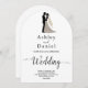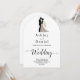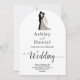 This elegant black-and-white arch wedding invitation is perfect for a modern wedding. The simple design features elegant black calligraphy and a bride and groom illustration on a clean white background. The invitation card includes the wedding details on the back instead of paying for a separate enclosure card.