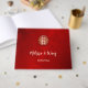 This Chinese wedding guest book features a gold double happiness symbol on a shimmering ruby red background.