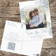 This beautiful design features save a date wedding QR code with the online website for more information, a save-the-date photo simple, with dusty blue floral greenery foliage, a 1 photo picture layout template, a modern elegant couple engaged picture, a wedding botanical flower leaves, engagement photos budget postcard, with trendy calligraphy brush script, a minimalist whimsical stylish typography, modern brush calligraphy script, simple save the date with elegant floral roses template