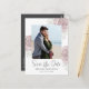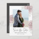 This beautiful design features save a date wedding QR code with the online website for more information, a save-the-date photo simple, with dusty rose floral greenery foliage, a 1 photo picture layout template, a modern elegant couple engaged picture, a wedding botanical flower leaves, engagement photos budget postcard, with trendy calligraphy brush script, a minimalist whimsical stylish typography, modern brush calligraphy script, simple save the date with elegant floral roses template