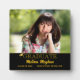 This modern elegant simple graduation gift photo plaque design features a gold graduation cap icon, graduate's photo, stylish gold lettering typography on black border. Perfect for graduation celebrations gift. Customise with your own photo, text, fonts and colours and make it yours.