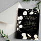 Beautiful bold black and white with gold foil simple eucalyptus leaves sprig wedding invitation. A minimalist greenery line art drawing, simplistic and stylish and perfect for a botanical diy printable download or modern printed wedding invitation. Easy to use templates with white elegant typography script on a black background. Unique artist created custom marriage invites to remind friends and family to keep the date free. A minimalistic foliage black and white wedding invite design. Original artwork by artist Catherine Sweetman