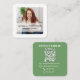 A simple design features a QR code social media photo, a modern simple minimalist contemporary, with an add your own photo logo, a contact info phone email website, with Facebook Instagram Pinterest twitter, a trendy stylish photograph picture pro, a basic clean digital scannable scan, an elegant minimalist design style, with a photo or graphic template, a simple green and white style.