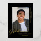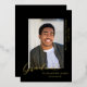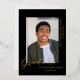 A simple, modern and elegant design for a graduation announcement with black background. The card has a space for one photo of the graduate and shows the word GRADUATE at the bottom of the photo in real gold foil. Below the photo is the name of the graduate and on the right side of the picture is the school name and class of 20XX. Black and gold make for an elegant combination.
