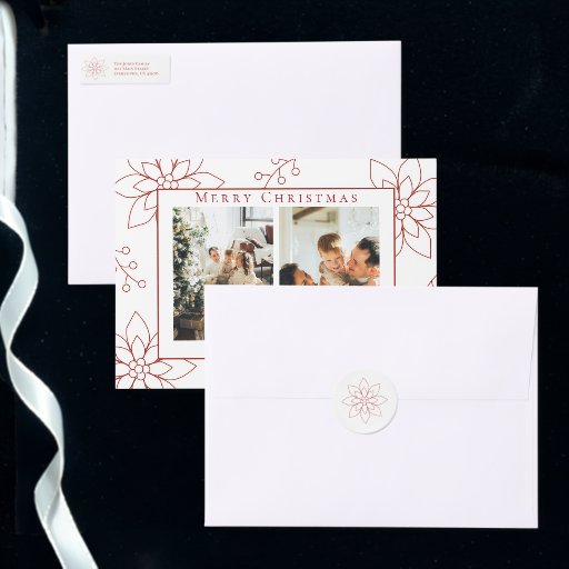 Modern Simple Red Poinsettia Two Photo Holiday Card