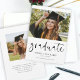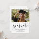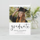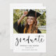 A modern graduation invitation featuring the word “graduate” on the front in stylish script calligraphy with your favourite photo, plus another senior photo on the back alongside your own custom text honouring the grad. This is the simple minimalist black and white version.