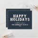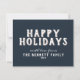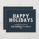 Modern Simple White Typography Happy Holidays Postcard. White typography is on a navy blue background - customise the family name and the year. The backside is navy blue with white spots.