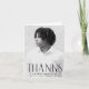 Simple graduation thank you card featuring the graduate's vertical photo with "Thanks" displayed in black, modern art deco lettering. Personalise the front of the photo graduation thank you card by adding the graduate's name, school name, and graduation year. The inside of the card features space for your custom thank you message in black lettering or leave it blank to write your own!