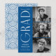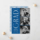 Stylish graduation announcement featuring the graduate's three photos located to the right of the design in a vertical layout. "Grad" is displayed in white, modern art deco lettering with a blue background. Personalize the modern photo graduation announcement by adding the graduate's name, graduation year, and school name. The design reverses to display a blue and white geometric swirl background. Perfect for both high school and college graduations!