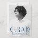Celebrate your graduate’s accomplishment with this elegant and simple graduation announcement. Featuring a vertical photo of the graduate, the word "Grad" is displayed in bold blue, modern art deco lettering for a chic and contemporary look. Personalize the front of this single-photo graduation announcement by adding the graduate's name, school, and graduation year. The reverse side showcases a stylish blue and white geometric swirl design, adding a touch of sophistication. Ideal for both high school and college graduates, this customizable announcement is the perfect way to share the exciting news with loved ones.