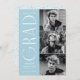 Stylish graduation announcement featuring the graduate's three photos located to the right of the design in a vertical layout. "Grad" is displayed in white, modern art deco lettering with a sky blue background. Personalize the modern photo graduation announcement by adding the graduate's name, graduation year, and school name. The design reverses to display a sky blue and white geometric swirl background. Perfect for both high school and college graduations!