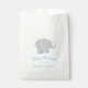Stylish and sweet custom baby shower favour bag features an adorable little newborn baby elephant calf with heart shaped splashes and custom text that can be personalised. Colour scheme of sky blue, grey, and white - colours are perfect for welcoming a baby boy.