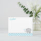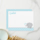 Sweet and whimsical baby shower thank you notes feature "Thanks!" text and an adorable newborn baby elephant calf with heart shaped splashes, with space for your handwritten message. The design includes a border pattern of diagonal stripes, polka dots on the back, and a baby boy colour scheme of light sky blue, grey, and white.