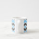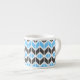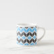 This modern espresso cup features a colourful geometric herringbone pattern in sky blue and dark grey shades.