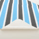 This sherpa blanket features a beautiful diagonal striped pattern in sky blue, dark grey, and white.