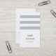 Modern and chic business card design in a unique vertical format features three wide slate blue-grey stripes on a white background, with your name and business name or title in an attractive mix of lowercase serif and modern caps typefaces. Add your full contact information to the back in dark charcoal blue lettering. Suitable for any occupation; example shown for interior design professions.