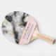 Personalised ping pong chamion paddle with an elegant and modern marbled pattern. White, black and smoky grey marble with thin ribbons of faux-gold swirls throughout the pattern. A light pink gradient background beneath the marbled pattern.