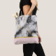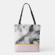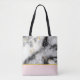 Tote bag with an elegant and modern marbled pattern. White, black and smoky grey marble with thin ribbons of faux-gold swirls throughout the pattern. A light pink gradient background beneath the marbled pattern.