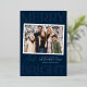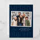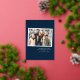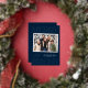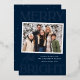 Modern holiday photo card featuring your horizontal photo bordered in a white instant photo frame. The phrase "Merry and Bright" is displayed in silver foil lettering with a festive navy background. Personalise the front of the foil Christmas card with your custom greeting, family name, and the year in white lettering. The card reverses to a navy background with subtle white dots (snow).
