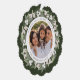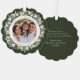 Celebrate the season with this elegant botanical Christmas ornament card, featuring your favourite family photo framed by a wreath of snowberries, cotton blooms, and sage green foliage on a dark green background. Personalise the front with your custom holiday greeting, name, and the year for a meaningful and festive touch. The back of the ornament card includes space for your personal message in white lettering, making it a beautiful keepsake to share your holiday cheer with loved ones.